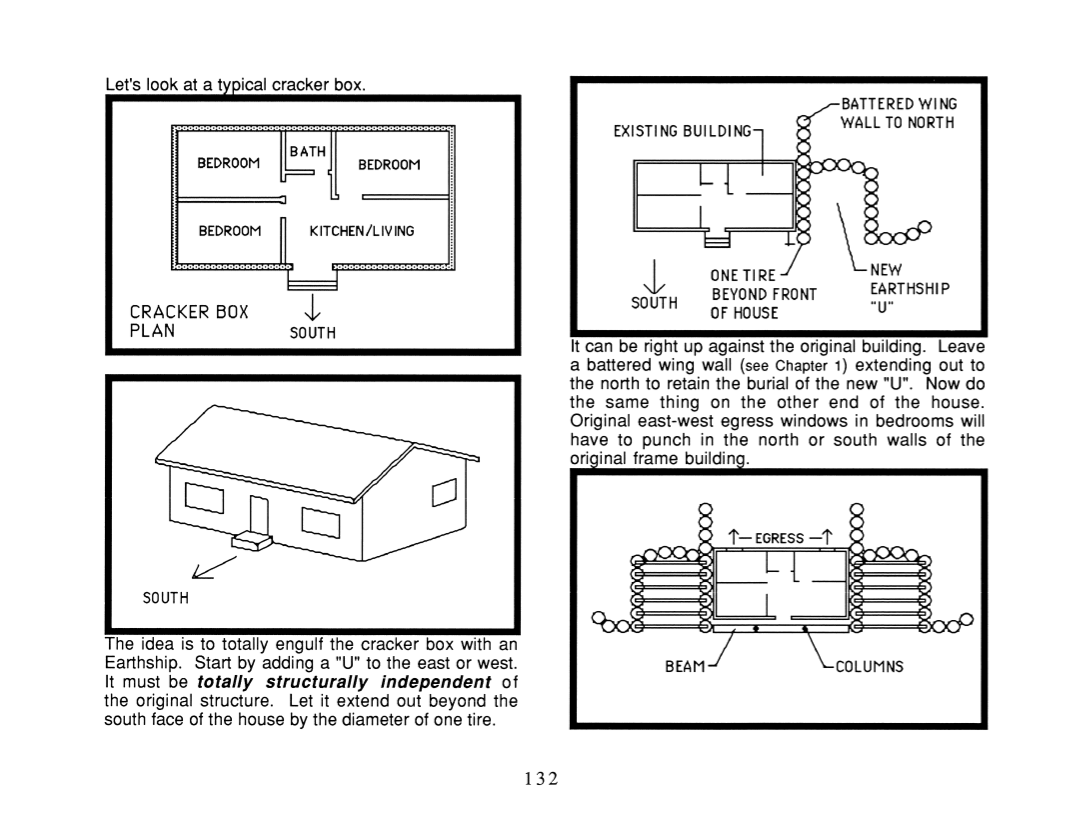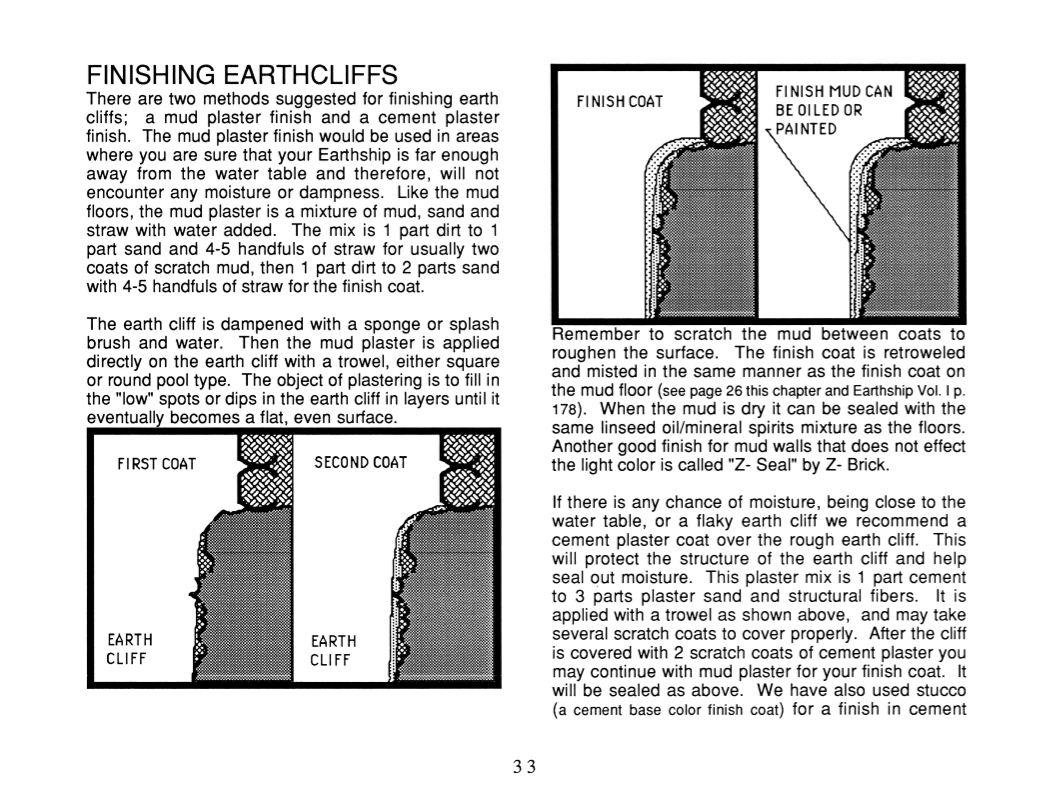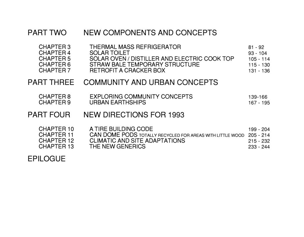Specific topic areas include refinements to the walls, bondbeam systems for the top of the walls, home-made trusses, retaining walls, gutter details, mudstone and flagstone floors, additional details on doors and windows, adding rooms to existing earthships, indoor and outdoor rainwater cisterns, additional water filtering information, improved indoor wastewater treatment systems, better solar power organization, back-up heaters, mud stoves, a thermal mass refrigerator, home-made solar composting toilets, and built-in solar ovens. Also covered are temporary structures to live in while building your Earthship, retroffiting an existing cracker-box house into a module within an Earthship, ideas for planning and initiating Earthship communities, proposals to apply the Earthship approach on a city-wide scale, building code recommendations for owner-builders and inspectors, applications for developing countries, and adaptations for unstable soils or marshy conditions.