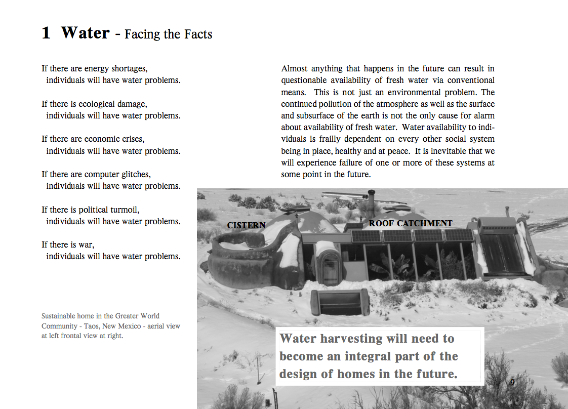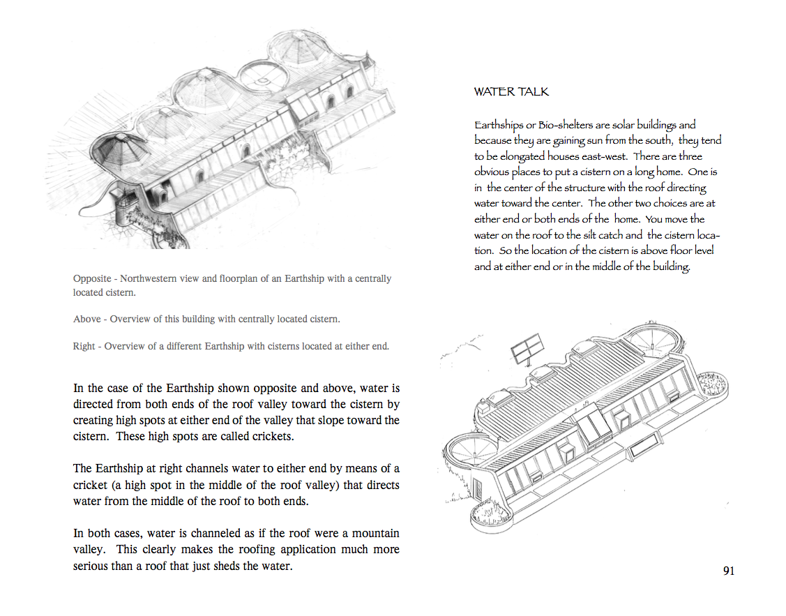 Water from the Sky is a significant expansion on water collection and treatment systems introduced in Reynold's Earthship books. The first part of the book delves into refinements of water catchment systems for Earthship homes, though the information could easily be applied to more conventional construction as well. Reynolds also expands on options for cisterns and proper filtering prior to use.