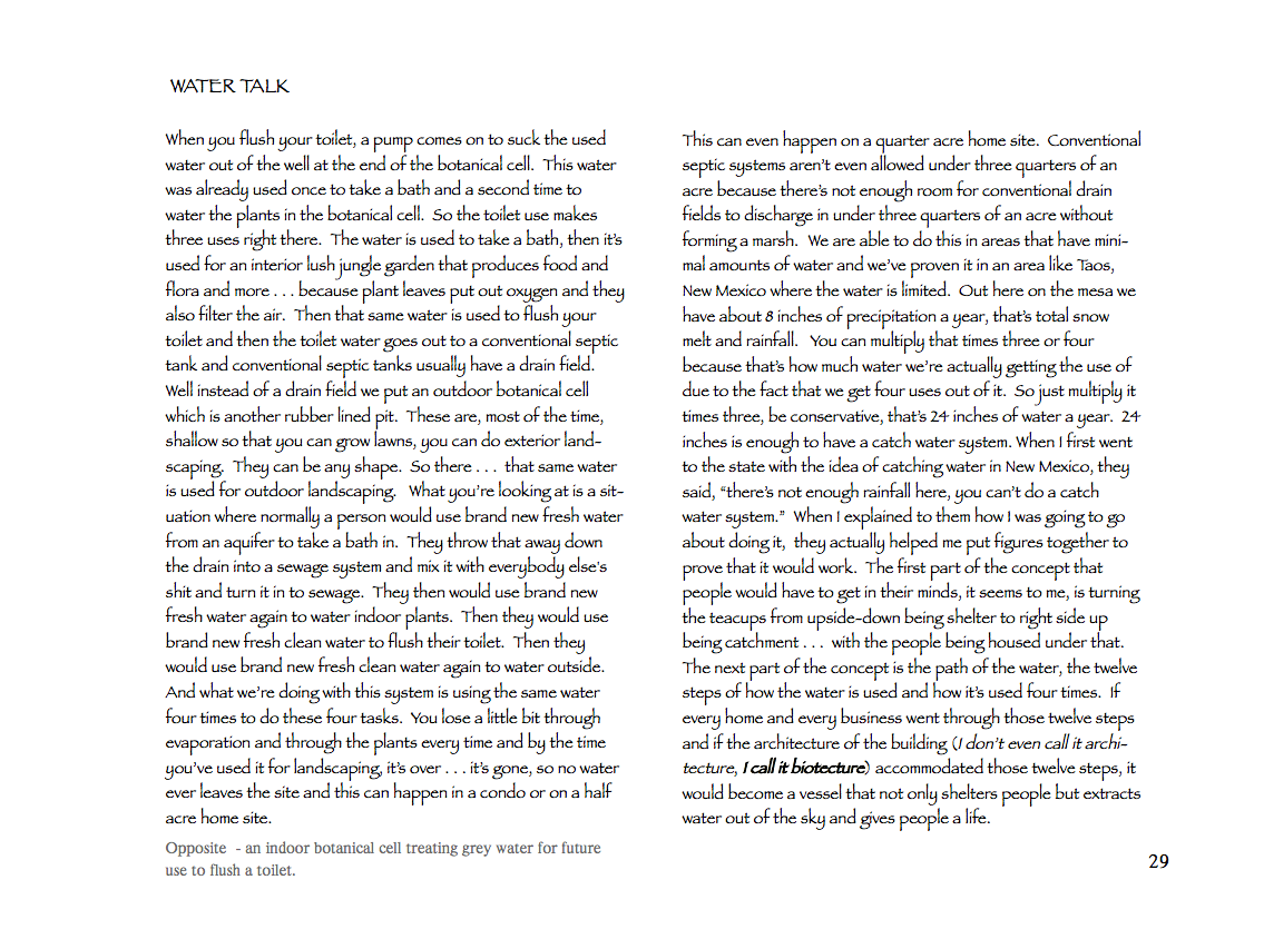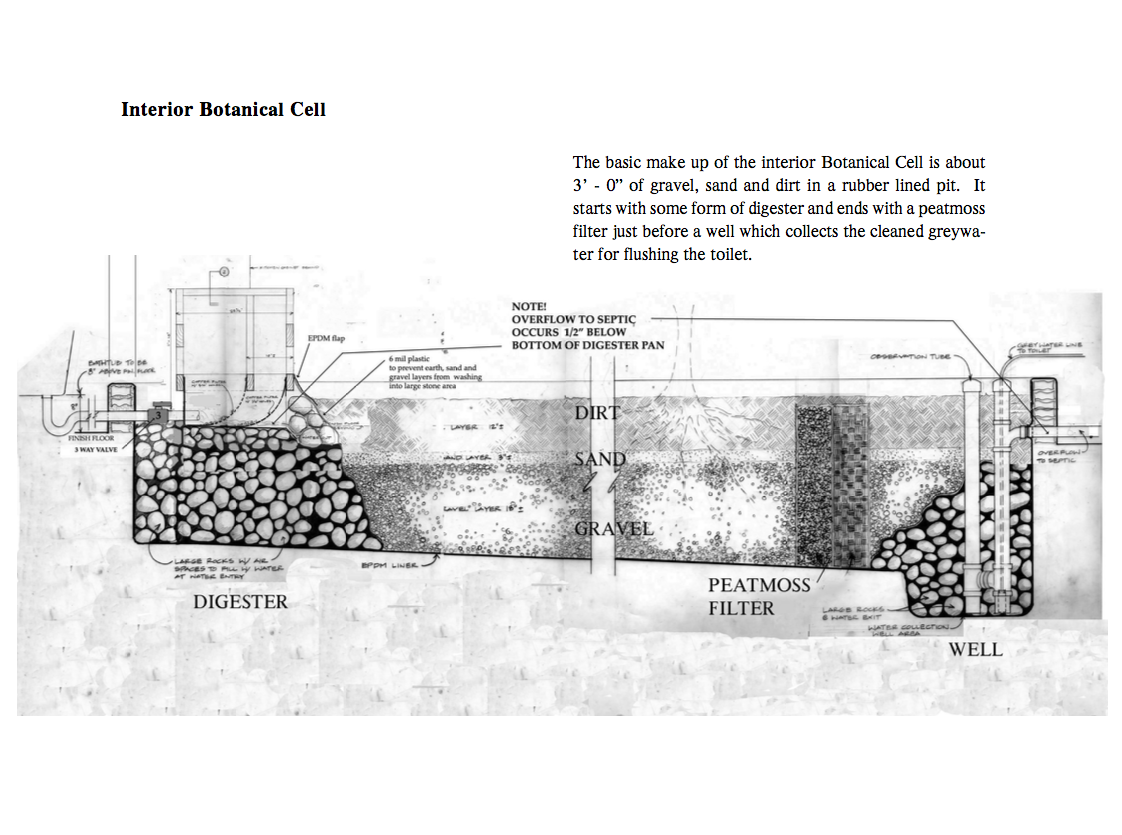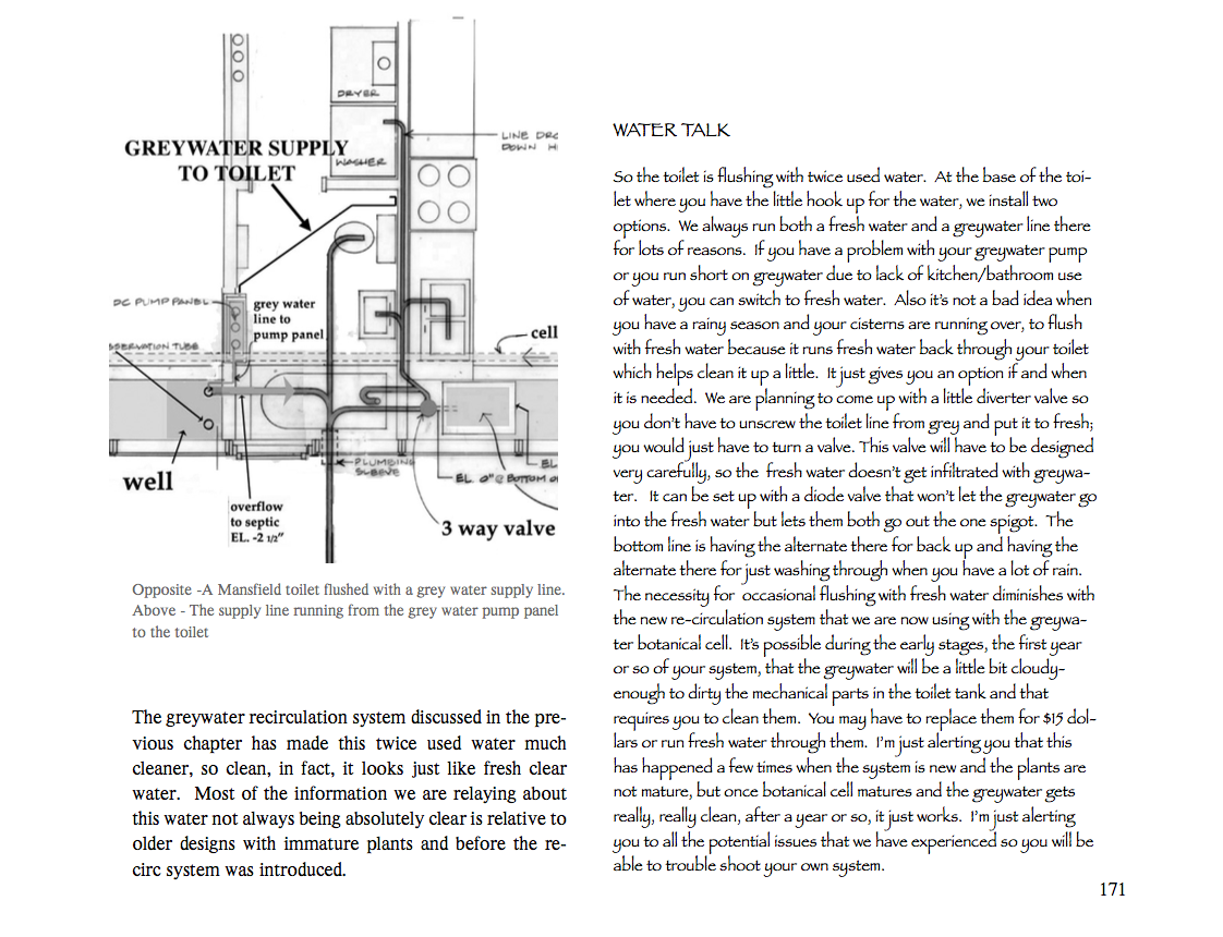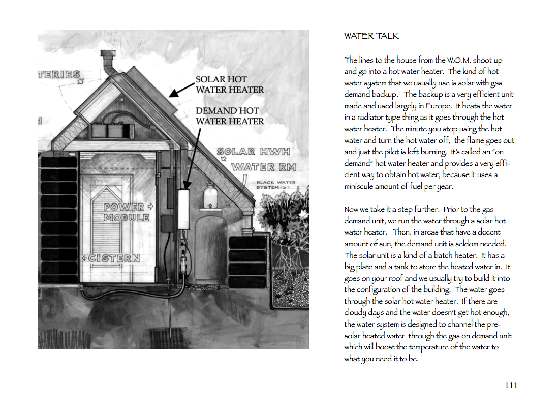 The book also covers "botanical cells," which are designed to both utilize and purify greywater for indoor and outdoor gardens and lawns. The cleansed water can be used for additional irrigating with a hose, or routed back for use in flushing a toilet. Although Reynold's largely favors composting toilets, he also shows how "blackwater" from a toilet can be cleansed and safely utilized through plant rock filters. These are cutting edge technologies in household greywater treatment, and Reynolds has presented the material in an accessible format for the do-it-yourself home builder.
