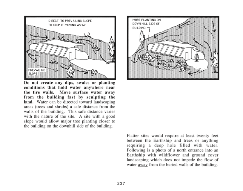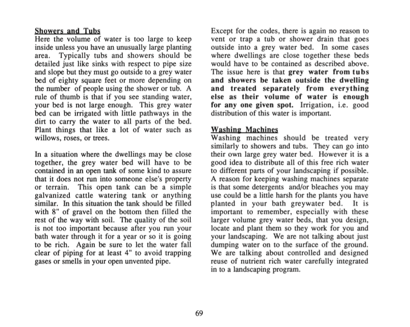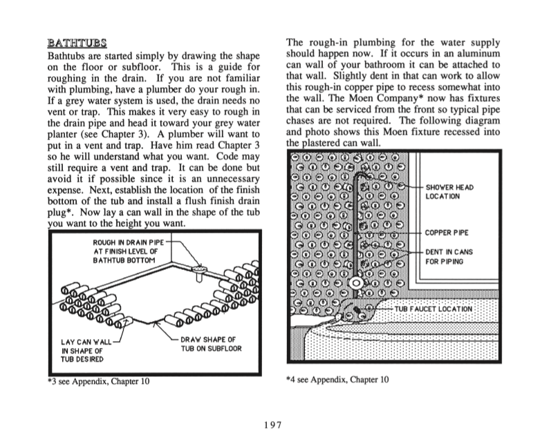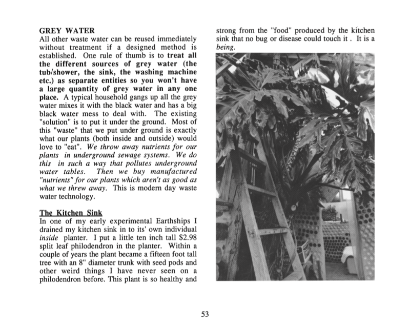 In a chapter on water systems, he deals with the water supply and waste water, including wells and rainwater catchment systems, greywater systems and composting toilets, plus conventional and alternative septic systems. His use of planters adjacent to kitchen and bathroom sinks for immediate use of wastewater is especially ingenious for its elegant simplicity.